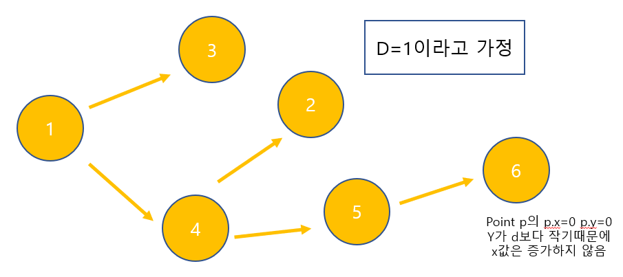 리프 노드에 도달하게 되면 다음 방문할 노드가 없기 때문에 돌아가면서 던질 수 있는 거리를 확인하기 위해 Y값을 증가시킨다. 또한 그 범위가 d보다 작으면 x값을 0 그대로 리턴하게 된다.