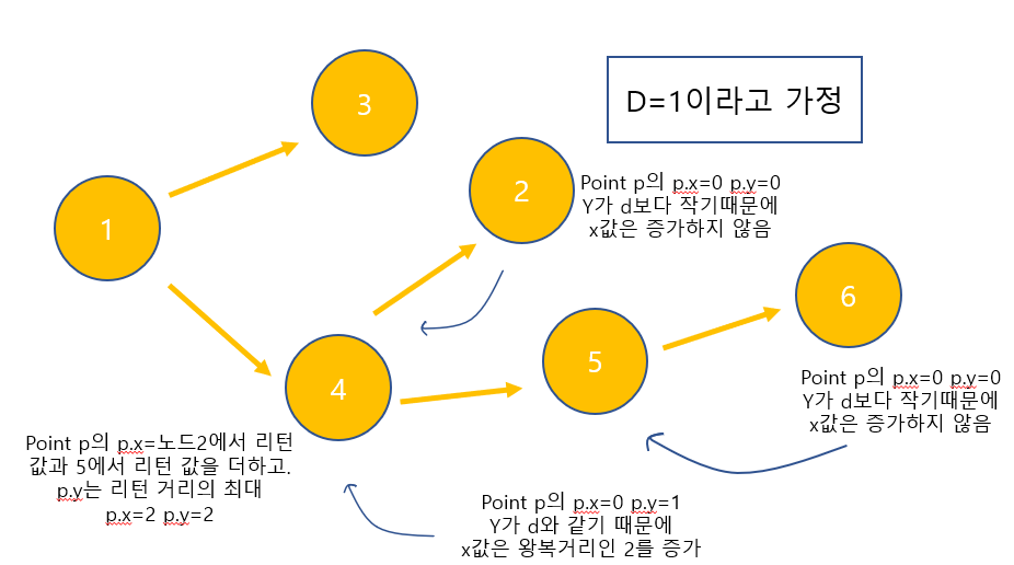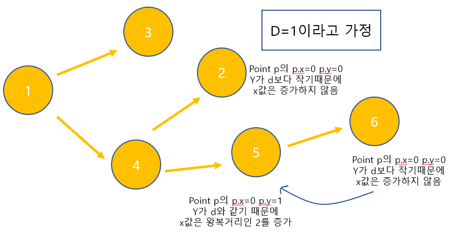 6의 리프노드에서 return을 하게 되면 5의 p.y값은 1이 되고 d와 같기 때문에 왕복거리인 x를 2 증가시킨다.