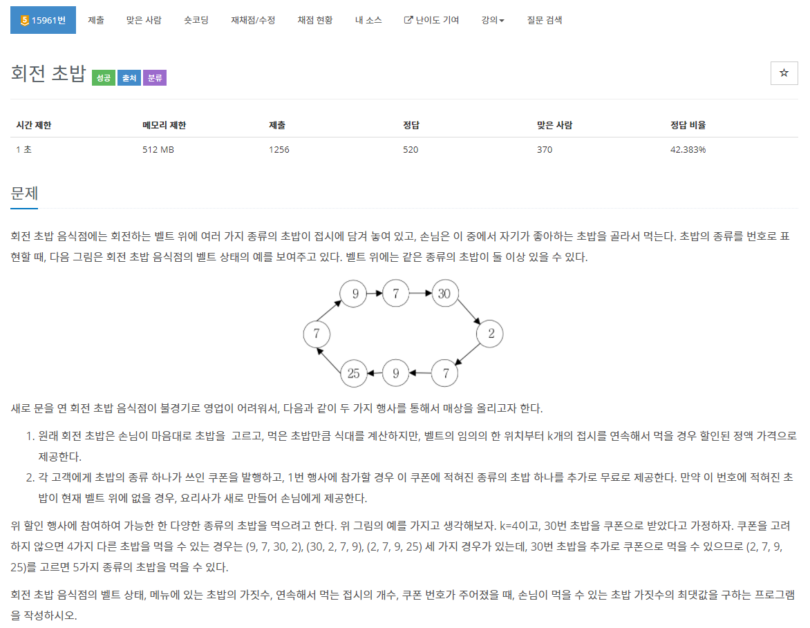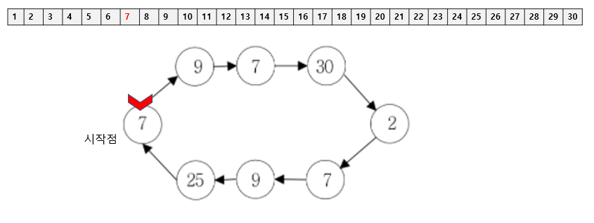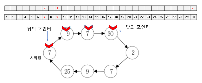 코드에서는 1차원 배열로 인해 원형으로 이어져 있지 않기 때문에 끝까지 간 다음 K이전까지 한 번 더 회전할 수 있도록 작성했다