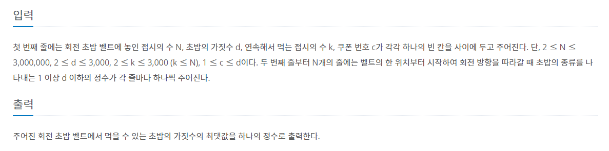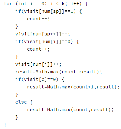 위의 코드는 기본적으로 맨 처음 시작점에서 k만큼 연속적으로 가면서 검사를 하고 만약 공짜로 주는 쿠폰 번호의 초밥을 안 먹을 경우 1을 더해주게 된다.