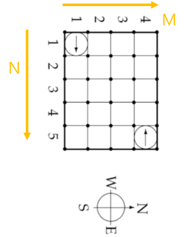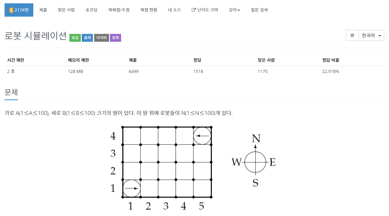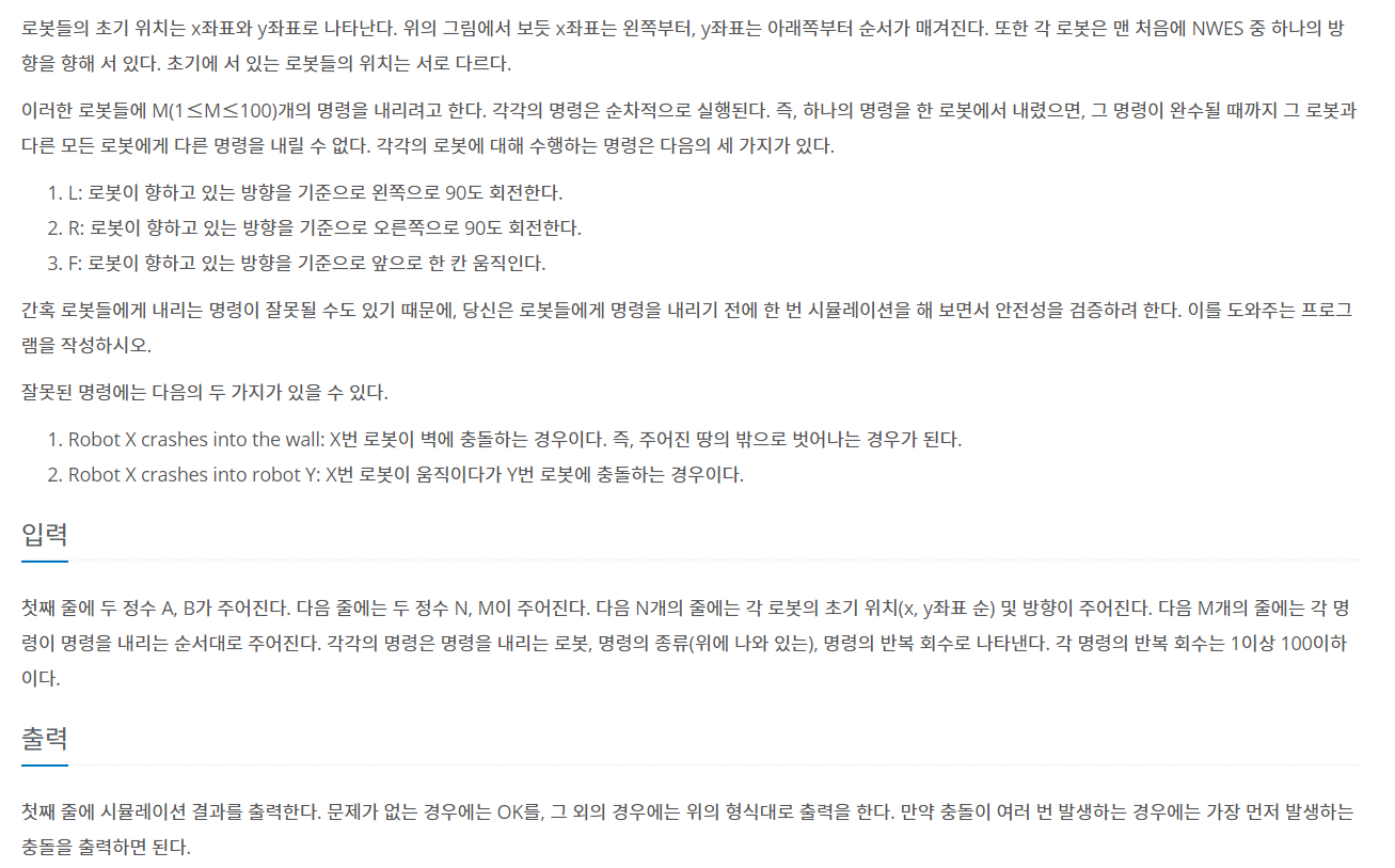 문제는 간단하다 각자의 위치에서 명령대로 수행하다 벽을 만나거나 다른 로봇과 부딪히면 종료하는 문제!