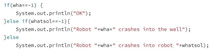 System.out.println("Robot "+wha+" crashes into robot "+whatsol);