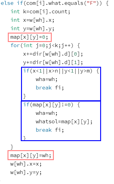 기존에 wha와 whatsol을 -1로 초기화시켜줬기 때문에 벽에 부딪히지 않았다면 wha값 -1 whatsol 값 -1 유지