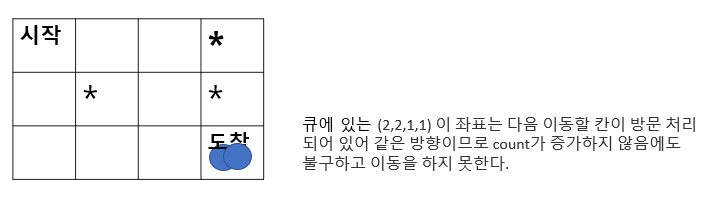 즉!! 이동할 지점이 같은 방향 이어 count가 작음에도 불구하고 visit 처리되어 그 방향으로 이동이 불가능하다!