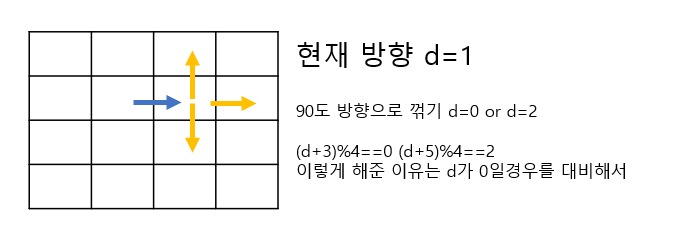 90도로 회전하거나 직선으로 가는 총 3가지 경우만 생각해준다.--> 즉 뒤로 반사되는 경우는 없음!