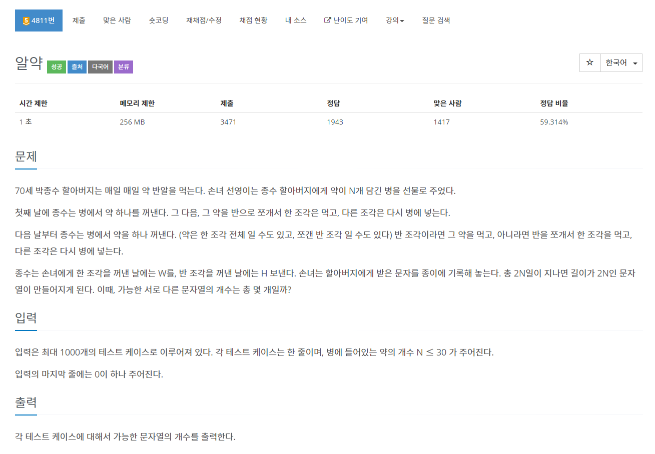 이 문제의 dp는 언제가 끝나는 조건인가? 당연히 한 조각 전체 알약이 없거나 한 조각이 하나와 반 조각이 없을 경우이다!