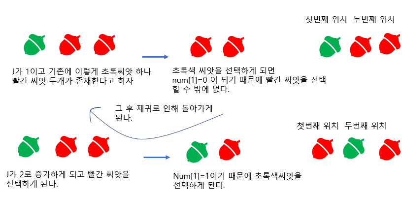 num[1]에는 초록씨앗의 수를 담고 num [2]에는 빨간 씨앗의 수를 담아서 중복이 되지 않도록 조합을 나타냈다.
