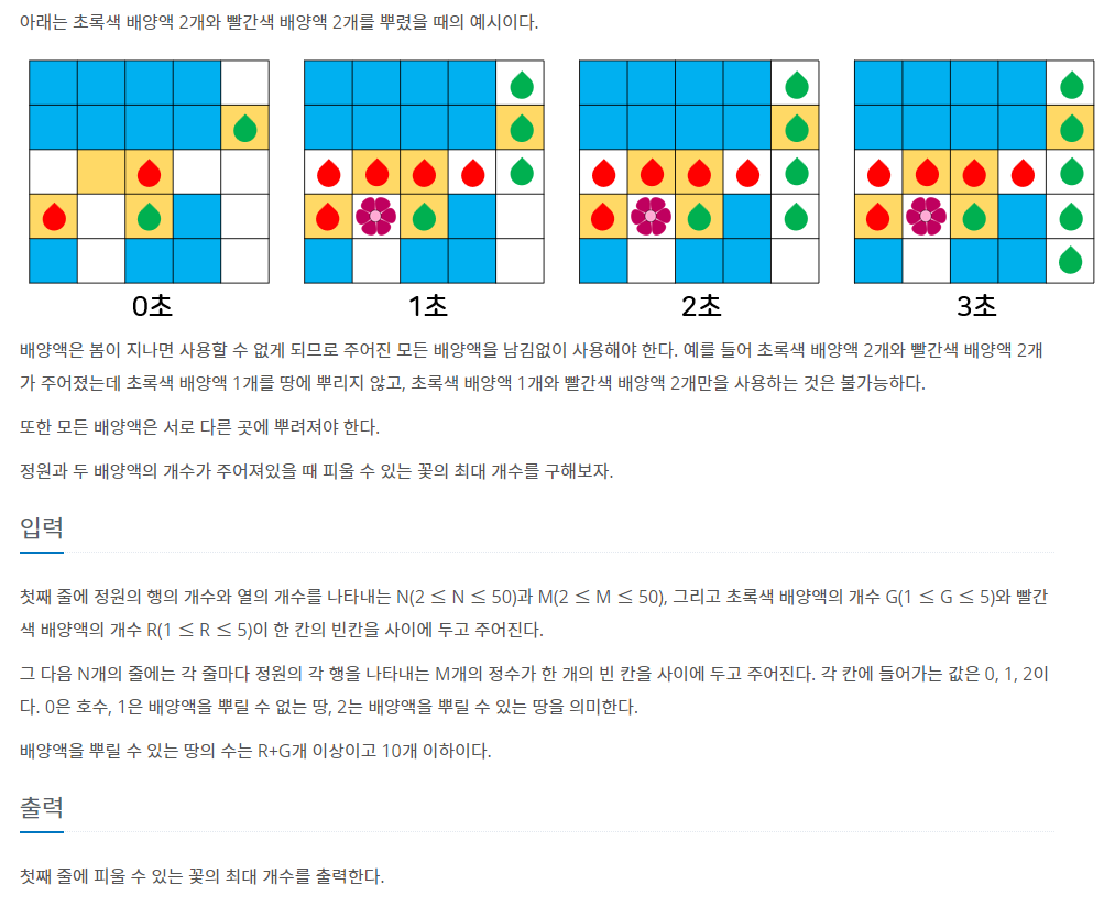 씨앗을 놓을 수 있는 위치를 조합으로 구한 다음 씨앗을 퍼트려 꽃의 개수를 구하는 시뮬레이션 문제이다.