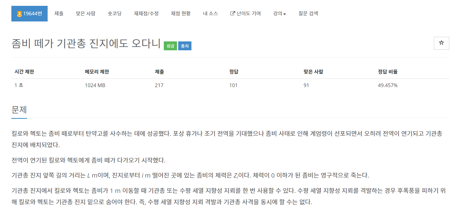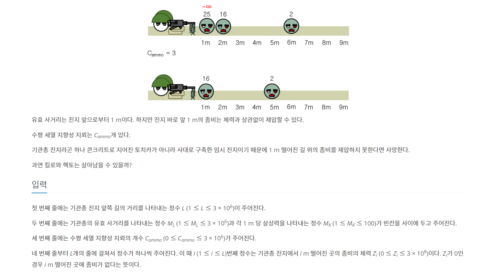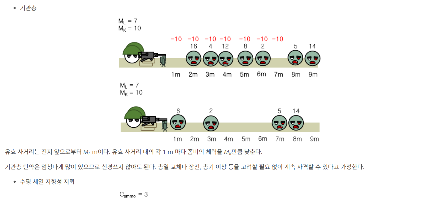 이 문제에서 가장 핵심은 기관통으로 죽일 수 있으면 죽이고 그렇지 않으면 폭탄을 사용하는 문제이다.