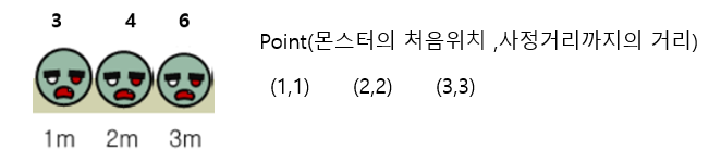 - 처음 기관총 사격 가능한 범위까지의 Point(몬스터의 위치, 사격 가능 범위)를 queue에 넣는다.
