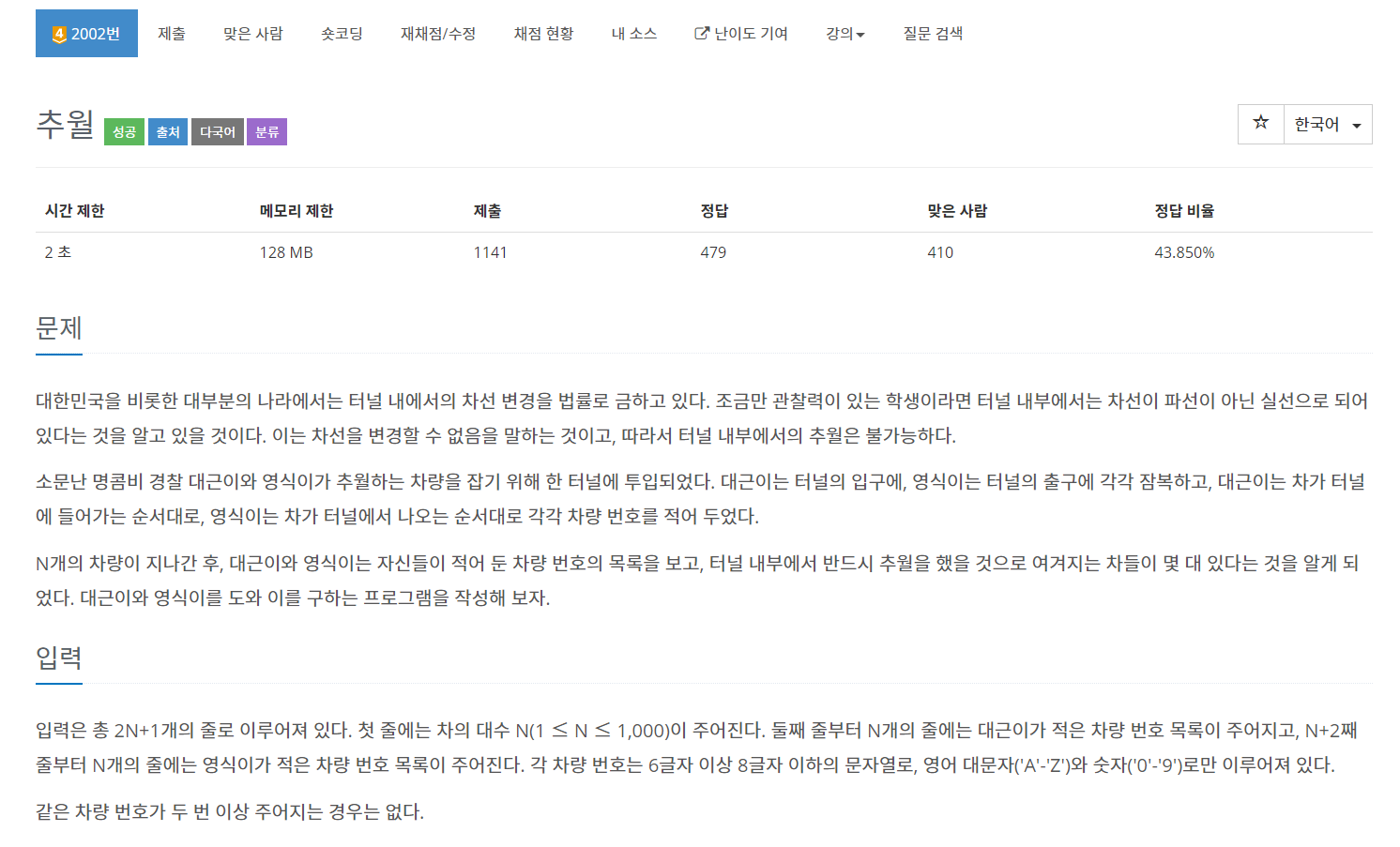- 시작 순서는 0번 부터 시작하고 hashmap에 있는 차가 또 나오면 순서를 확인하고 이후 번호면 count를 해준다. 이때 visit 배열에 방문처리를 함으로써 이미 나온 것을 표시해준다.