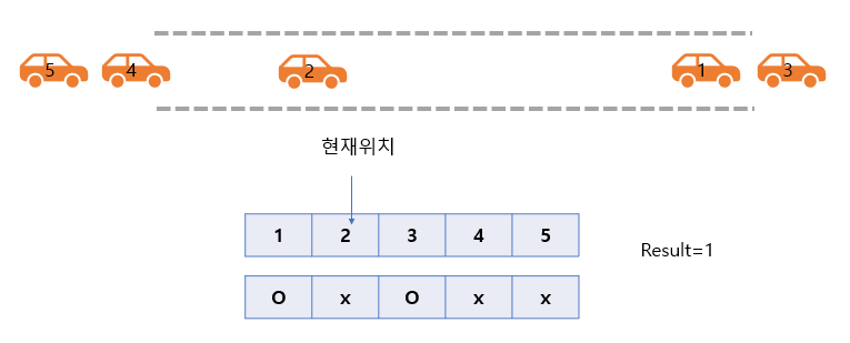 3번 차량이 먼저 나가게 되면 현재 위치보다 크기 때문에 result를 1 더해주고 나갔다는 표시를 해준다.
