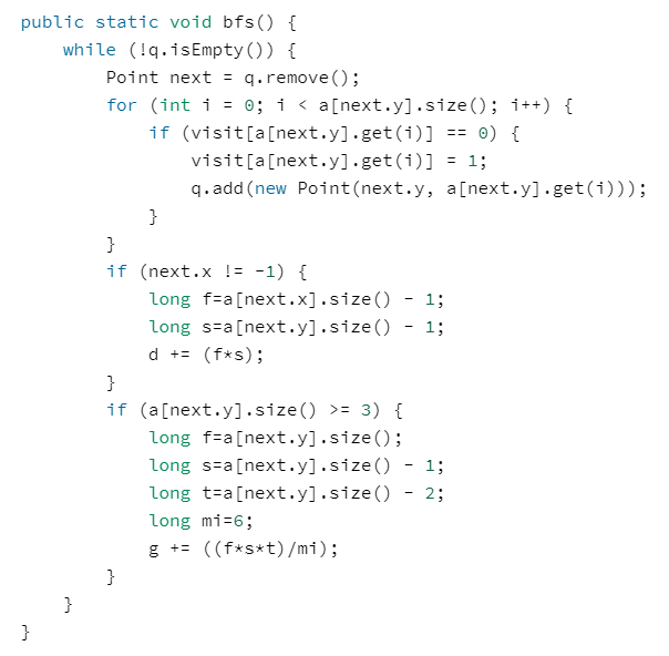 bfs를 할 때 시작점을 큐에 넣어줄 때 이전 노드가 존재하지 않기 때문에 -1을 x좌표에 1을 y좌표에 넣어 x좌표를 이전 좌표 y좌표를 현재 좌표로 나타내 동시에 Point로 받아서 큐에 저장해서 x좌표가 -1이 아닐 때에만 ㄷ의 경우를 계산해주도록 처리를 했다.