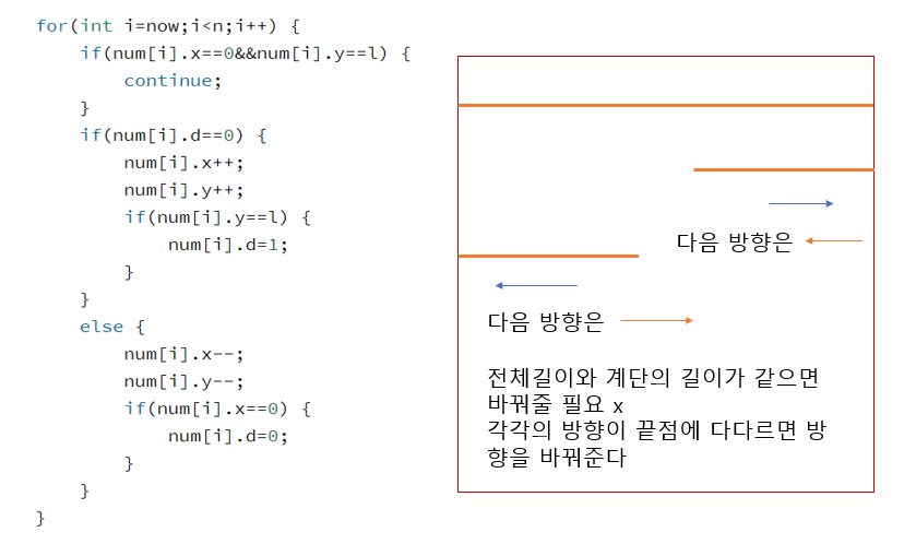 - 계단을 이동시켜준다. (이동 끝점에 도착하면 방향을 바꿔준다.)