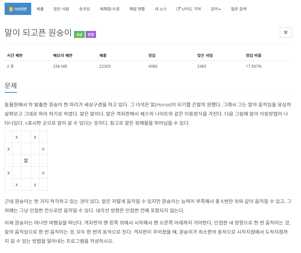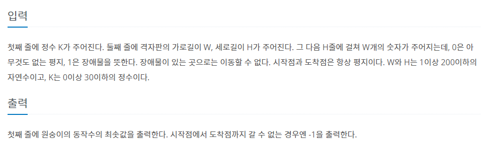 기존의 BFS 방법에서 조금 어려워진 탐색 문제이다. 고려해야 할 점은 BFS탐색을 하면서 말처럼 이동하는 횟수가 K번 이내, 나머지는 원숭이처럼 이동해서 목적지로 이동할 수 있는지 체크를 하는 문제이다.