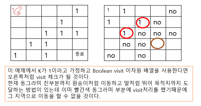 또한 다른 방법은 visit 이차원 배열을 원숭이처럼 이동할 때는 1로 표시하고 말처럼 이동할때는 2로 표시해서 처리해주고 두 가지 방법으로 도달했을 경우 3으로 바꿔주는 방법 또한 있을 것이다. 이렇게 하면 내가 풀어준 문제보다 메모리를 더 최소화할 수 있다.