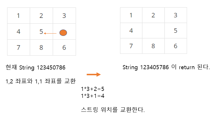 - 각각의 맵의 상태를 String으로 저장해서 count와 함께 현재 비어있는 위치를 보관하는 class를 선언했다.